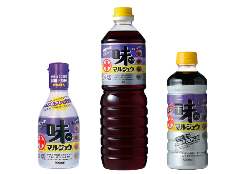 「味マルジュウ」のおいしさそのまま一般的なしょうゆと比べて食塩分は1/2。味と香りはそのままに食塩分を7.5%にしました。用途多彩なおいしい「減塩だししょうゆ」です。