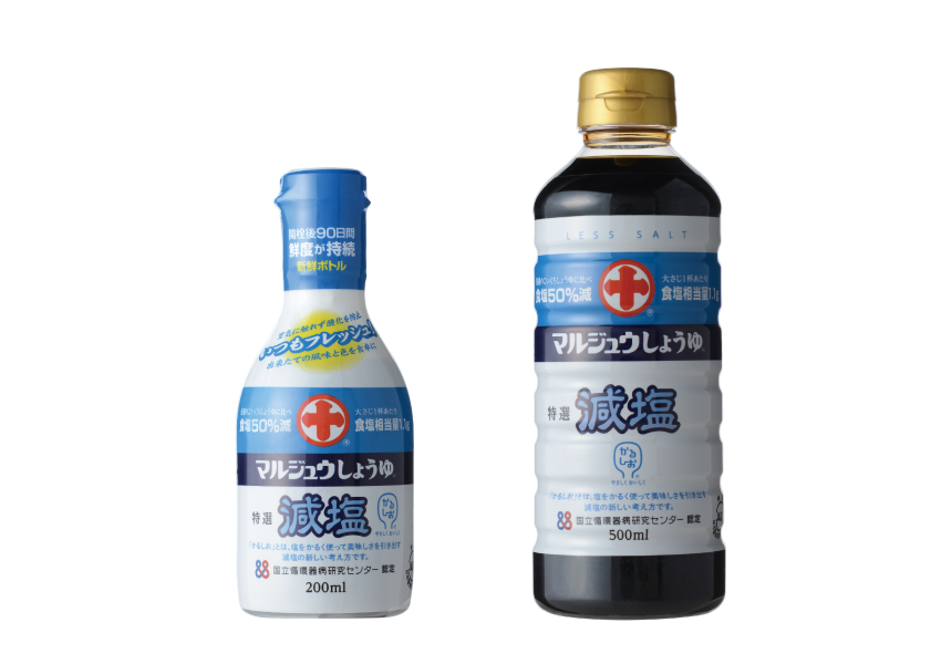 食塩分が気になる方へ。普通のこいくちしょうゆと比較し食塩50%カットの「マルジュウしょうゆ特選減塩」が、国立循環器病研究センターが推奨する「かるしお」の認定を受けリニューアル。